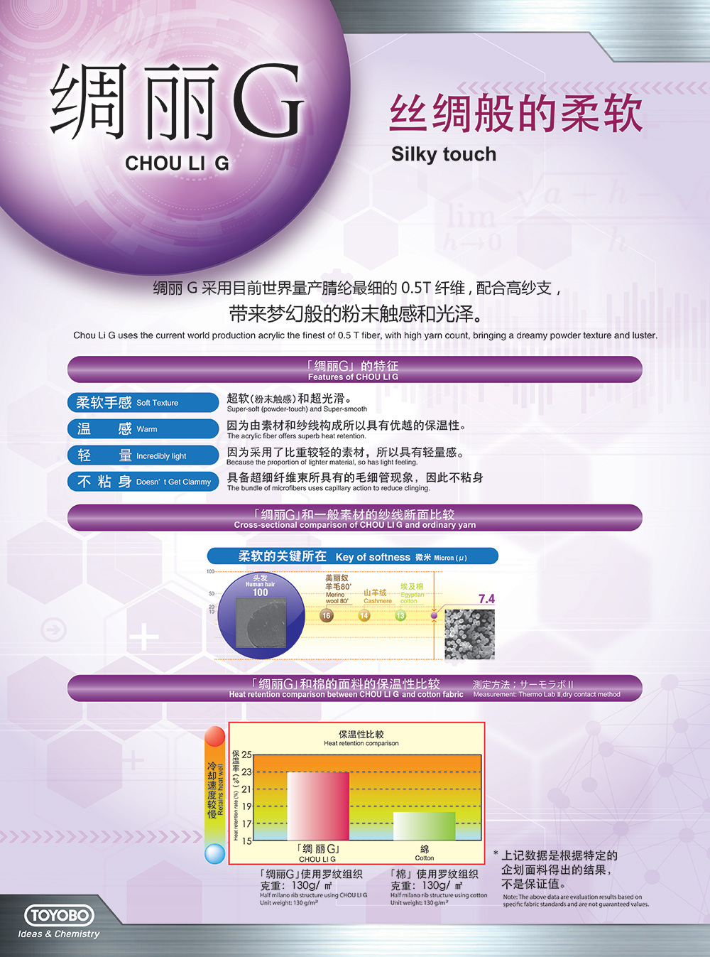綢麗G采用目前世界量產(chǎn)腈綸最細(xì)的0.5T纖維,配合高紗支,帶來夢幻般的粉末觸感和光澤。