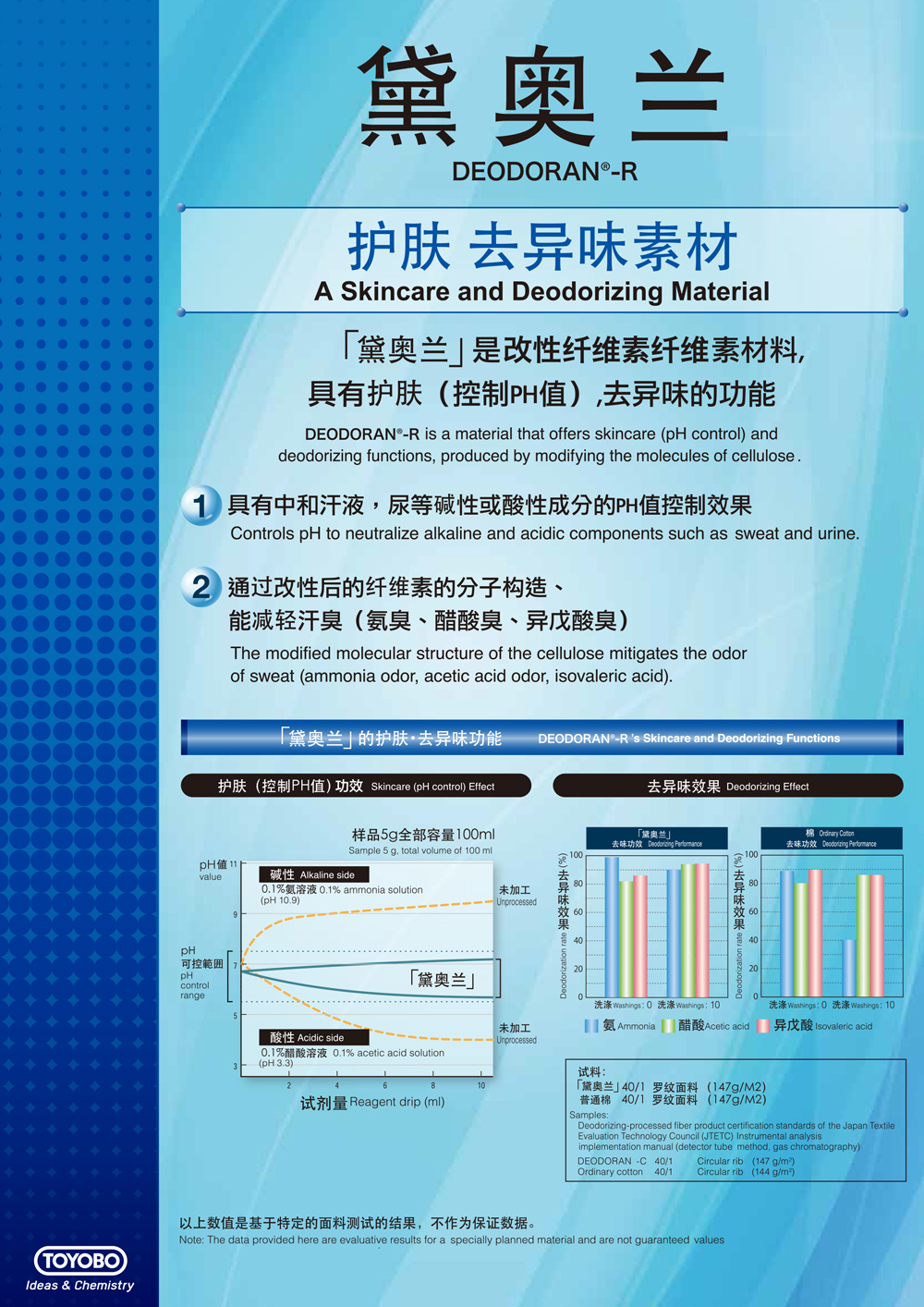 [黛奧蘭]是改性纖維素纖維材料,具有護膚(控制PH值),去異味的功能。